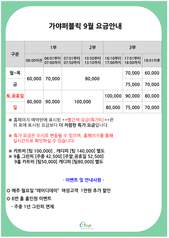 <가야CC 퍼블릭 9월 요금 안내>