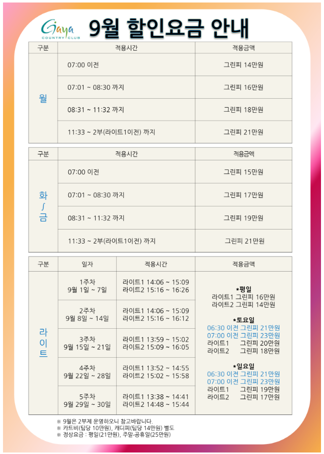 <가야CC 9월 할인요금 안내>