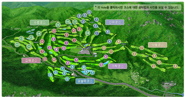 현재는 신어, 낙동, 김해, 수로, 가락의 5개 정규코스와 더불어 대중제 9홀까지 보유한