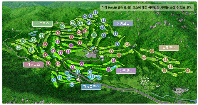 현재는 신어, 낙동, 김해, 수로, 가락 5개 정규 코스와 더불어 대중제 9홀까지 보유한