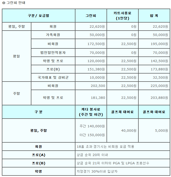 - 정회원 그린피 주중/ 주말 22,620원 (카트비 면제)
