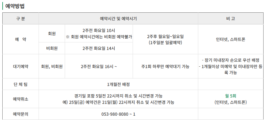 - 예약취소 및 시간 변경은 경기일 포함 5일 전 22시까지 가능하며, 22시 이후에는 예약취소, 날짜 및 시간 변경 불가합니다