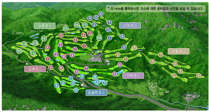 현재는 신어, 낙동, 김해, 수로, 가럭의 5개 정규 코스와 더불어 대중제 9홀까지 보유한